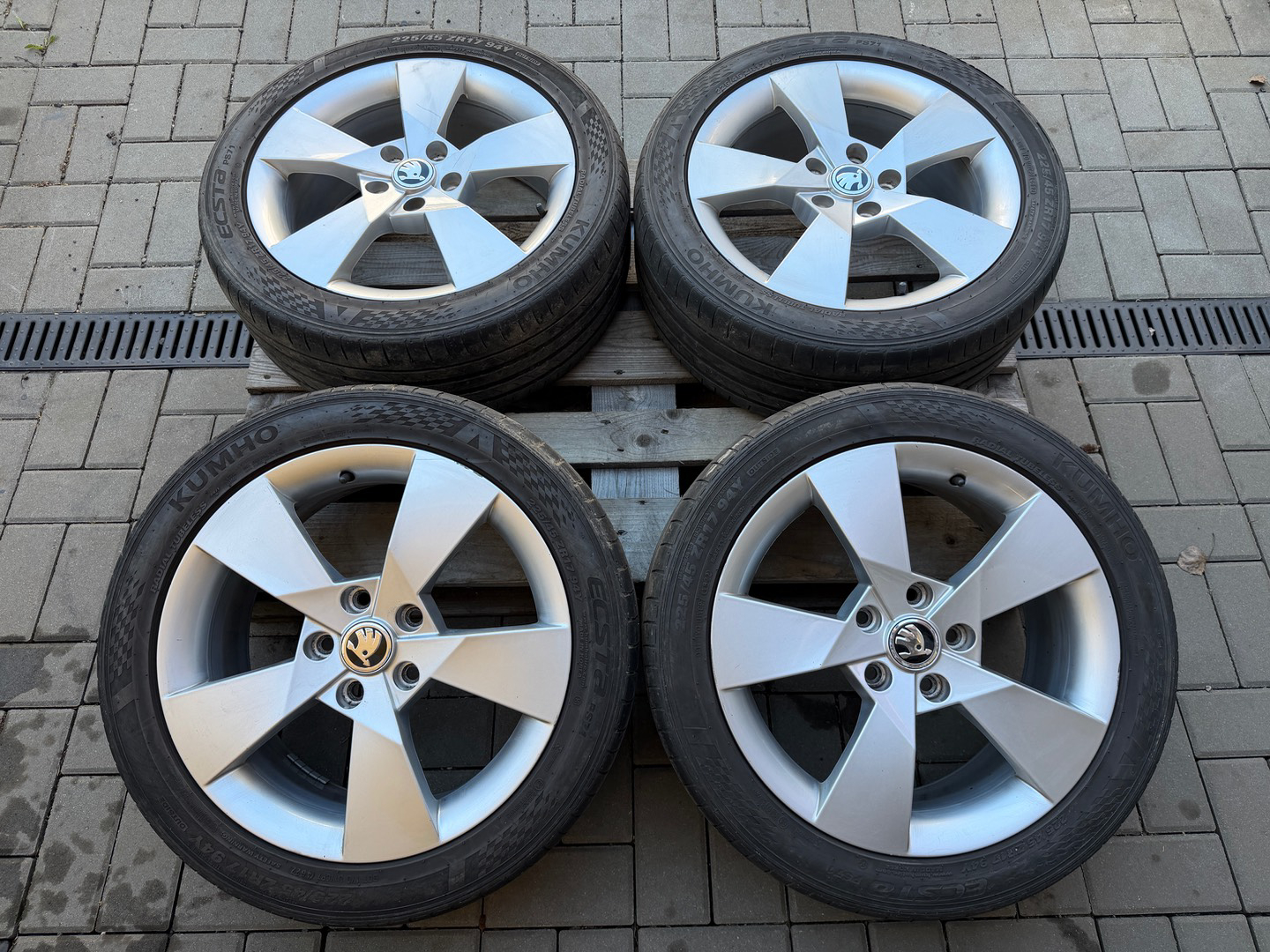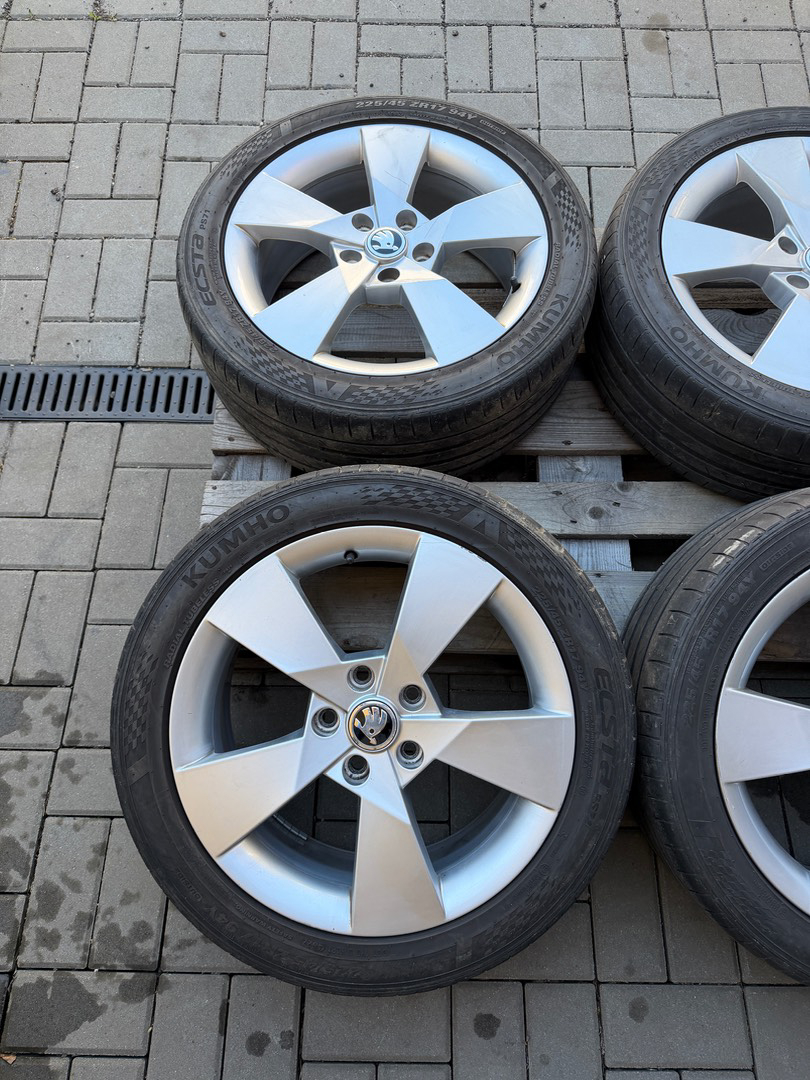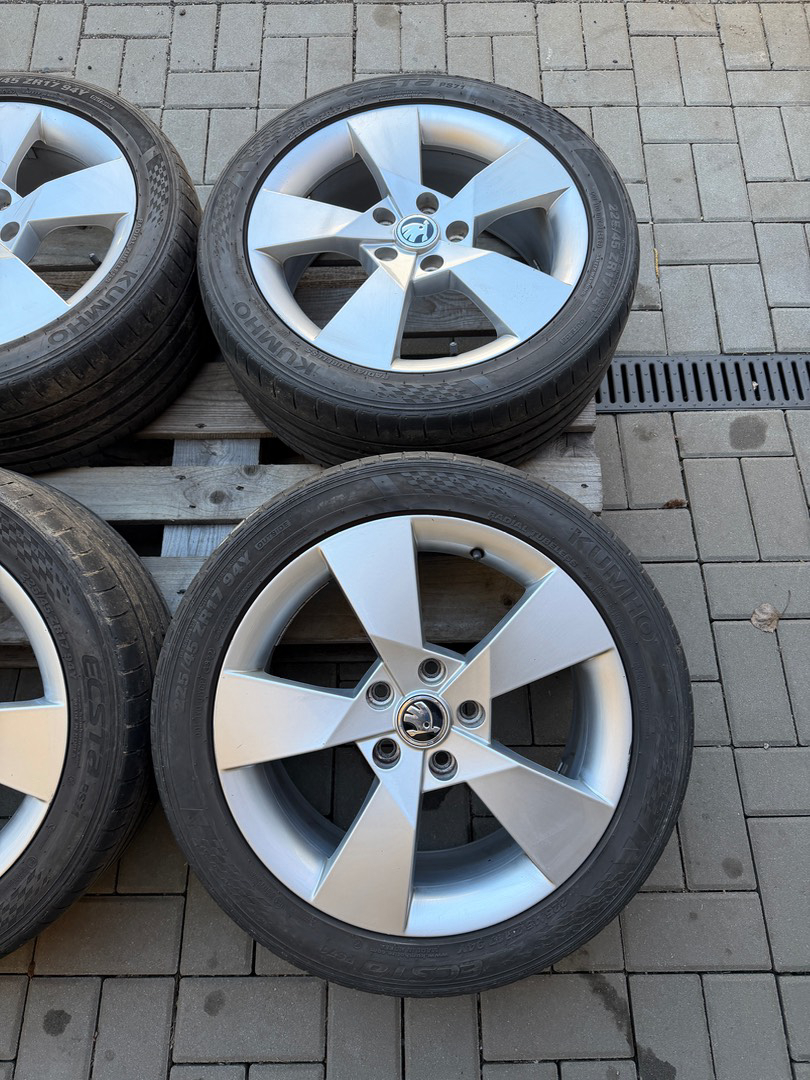 Prodám hliníková kola, disky značky ŠKODA, model Denom s pneu Kumho 225/45/17 letní , stav viz foto